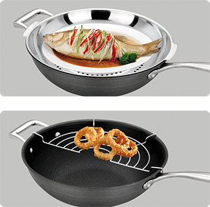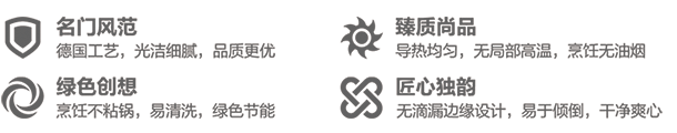 欧式全能炒锅 煎炒炸蒸 一锅打尽 世界最顶级不粘涂层,美国杜邦认证特氟龙不粘,100%绿色健康,对人体无害。最顶级的太空硬质氧化技术,氧化层达到30微米,超硬超耐磨。加厚钢盖,烹饪时形成蒸汽锁,锁住美味不流失,全钢配件,顶级奢华。